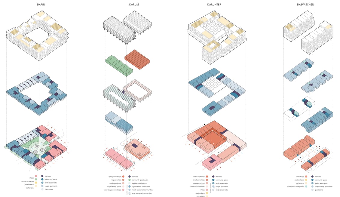 Wilhelmsburg soll sich nachhaltig verändern, die lokale Identität und Ästhetik bewahren, die bestehenden Unternehmen und Anwohner erhalten und einen funktionalen und sozialen Mix schaffen. Die entwickelten vier städtischen Typologien – DA-RIN, DA-RUM, DA-RUNTER und DA-ZWISCHEN – können mit unterschiedlichen räumlichen Qualitäten überzeugen. Die vier neuen Orte werden zum Zentrum des urbanen Zusammenlebens und verweben Bereiche des produktiven, wohnlichen und kulturellen Lebens.