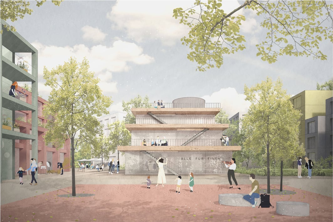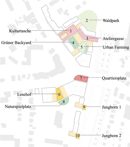 Neben privaten Vorgärten entstehen entlang des Jungborn vereinzelnd gemeinschaftliche, öffentliche Nutzungen im Erdgeschoss. Diese bieten Raum für nachbarschaftliches Zusammenkommen und schaffen Übergänge zu der großzügigen, öffentlichen Grünfläche auf dem Autobahndeckel.