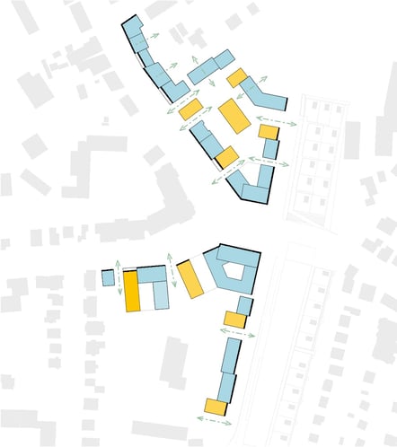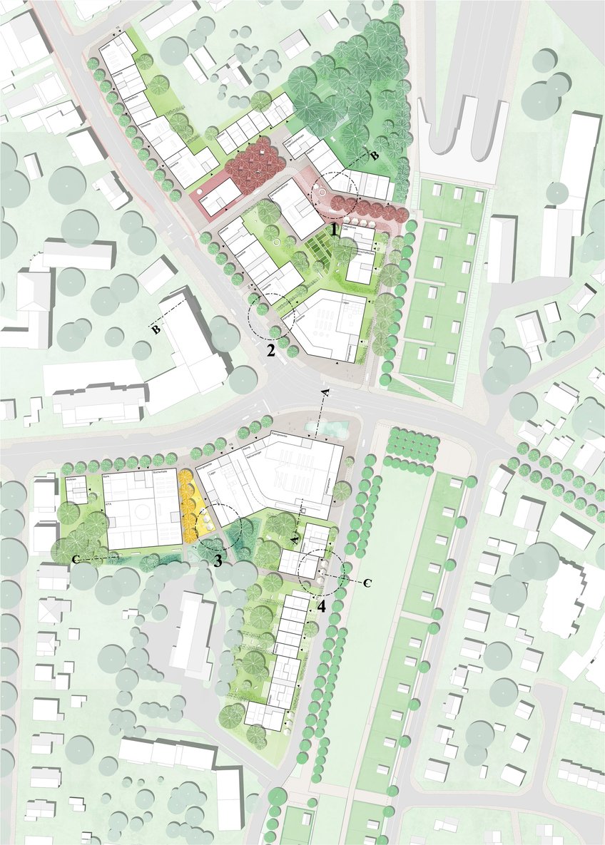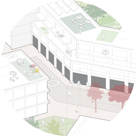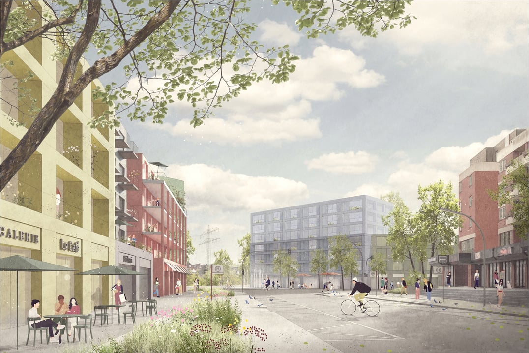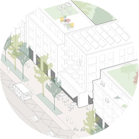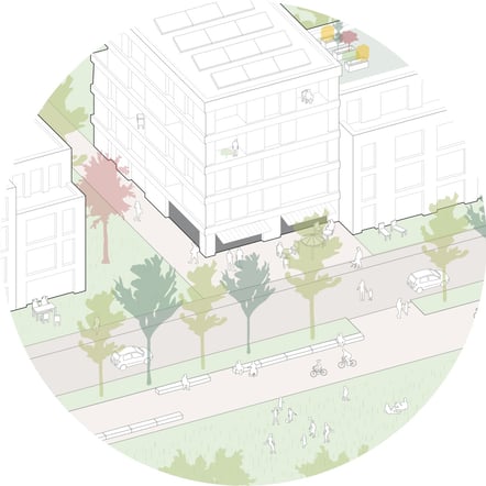 Vor- und Rücksprünge der Hauptfassaden untermauern eine Gliederung in einzelne Gebäude und schaffen einen für den Menschen angemessenen Maßstab. Die öffentliche Nutzung im Erdgeschoss wird durch die durchlaufende Sockelzone hervorgehoben. Dachterrassen und Balkone beleben den Straßenraum und integrieren die Wohnnutzung in das Straßenbild.