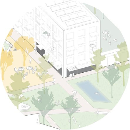 Der „Lesehof“ bietet Aufenthaltsbereiche in einer räumlichen Aufweitung mit Blick ins Grüne. Durch die Anordnung der Bücherhalle, eines Cafés und einer weiteren Kita ergeben sich Synergien. Der
