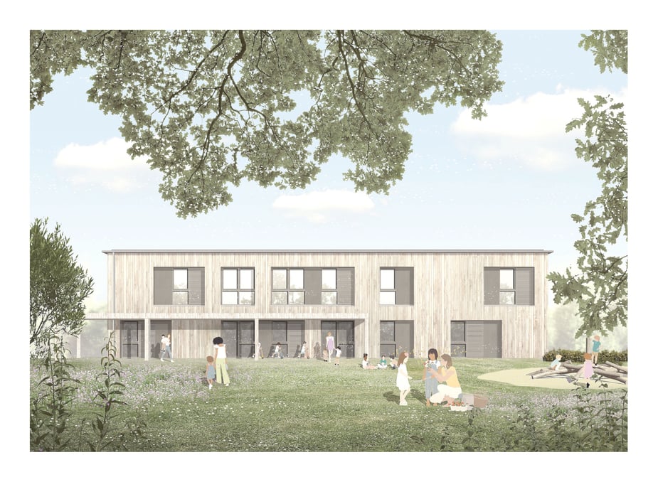 Bei der Entwicklung von Schulstandorten sollen künftig zugleich auch Kita-Standorte errichtet werden. Für diese Zielsetzung haben Herr&Schnell Architekten im Auftrag der Stadt Hamburg ein modulares Konzept entwickelt. Das „Kita-Haus“ ist aufgrund der modularen Holzbauweise flexibel in der Raumaufteilung für die individuellen Anforderungen und wird in kurzer Zeit auf den jeweiligen Schulgrundstücken errichtet. Die erste realisierte Kita wird am Schulstandort Sinstorf entstehen. Die einladende Eingangssituation öffnet sich den Räumen im Inneren, die sich in Krippenbereiche im Erdgeschoss, sowie Elementarbereiche im Obergeschoss gliedern. Die Aufteilung der Aufenthaltsräume schafft durch verschiedene Inhalte wie Spiel- und Lesebereiche eine angemessene Atmosphäre für Kinder und Betreuer. Bodentiefe Fenster sorgen für helle, lichtdurchflutete Räume. Durch die helle Holzfassade, macht das Gebäude eine freundliche und einladende Geste. Der auskragende Sonnen- und Regenschutz ermutigt die Kinder zu jedem Wetter und Jahreszeit, draußen im Grünen zu spielen. Der Kita-Träger wird in die Planung eng eingebunden und so wird der Bau an die Bedürfnisse angepasst. Die Dachflächen aller Kitas werden dazu begrünt und leisten einen Beitrag für das Klima, indem Sie als Filter für Staub und Lärm und Temperaturausgleich dienen.