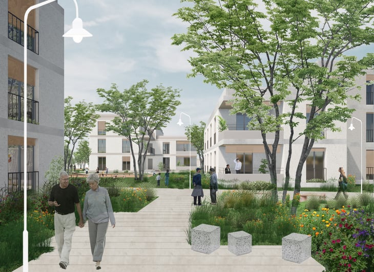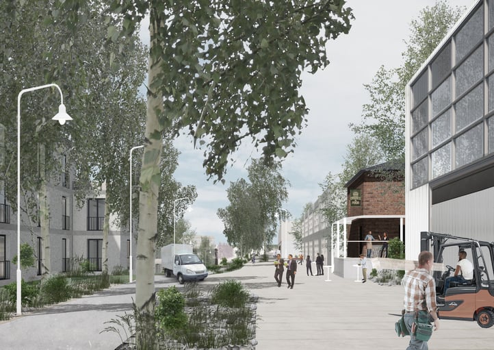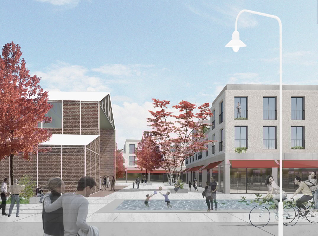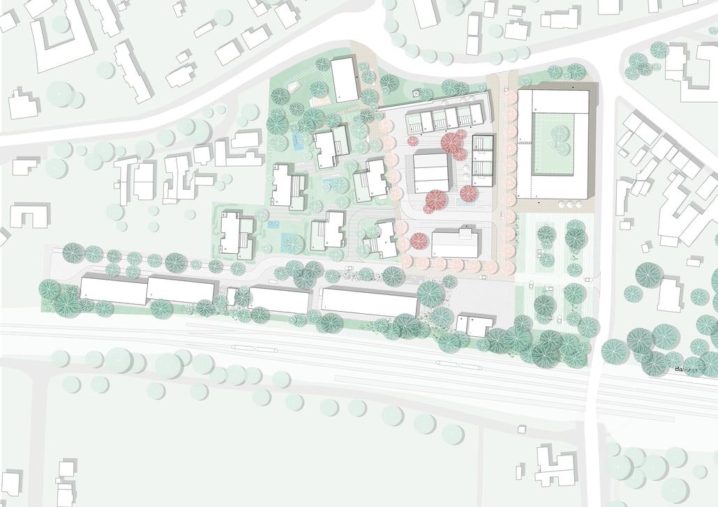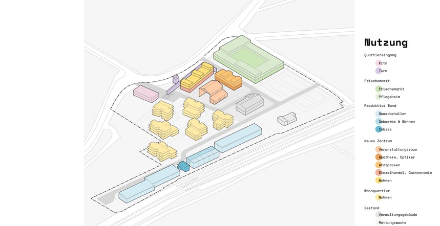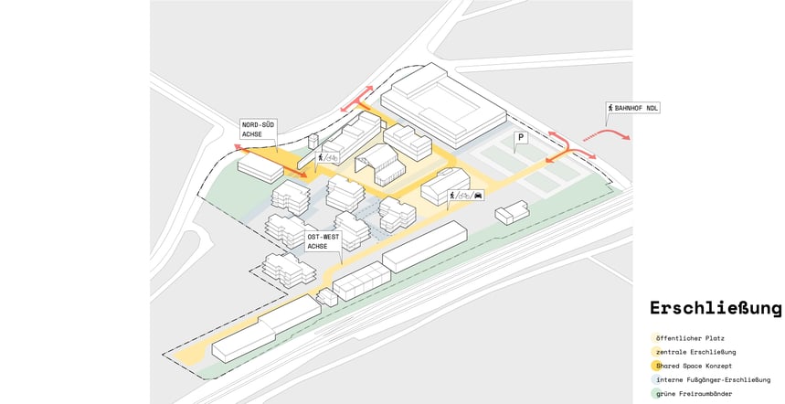 Die städtebauliche Konzeption greift diese besondere Lage auf und übernimmt sie anhand dreier Hauptelemente ins Innere: Der u-förmige Boulevard führt die vorhandene Nord-Südachse ins Areal und fokussiert auf sanfte Mobilität, die ost-west verlaufenden Erschließungsstraße bindet Gewerbehallen und Wohnquartier ans Straßennetz an und die querenden Freiräumbänder eröffnen vielfältige Atmosphären und Bewegungsmöglichkeiten im Gebiet. Entlang des Boulevards finden sich öffentliche Einrichtungen, Handel und Dienstleistungen sowie ein teilüberdachter Platz. Im Westen des Gebiets gruppieren sich sechs Baukörper zu einem kleinteiligen Wohnquartier mit gemeinschaftlichen Gartenhöfen. Im Süden liegt ein produktives Band mit Gewerbeeinheiten in unterschiedlichen Größen. Im Osten werden ein Supermarkt sowie ein Pflegeheim zu einem größeren Volumen gestapelt.Differenzierte Bepflanzungen und Bodenbeläge unterstreichen den Charakter des jeweiligen Quartiersteils während wenige charakteristische Elemente – wie etwa Straßenleuchten – sich über das gesamte Areal streuen.