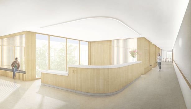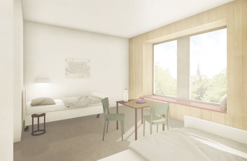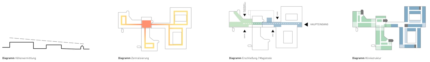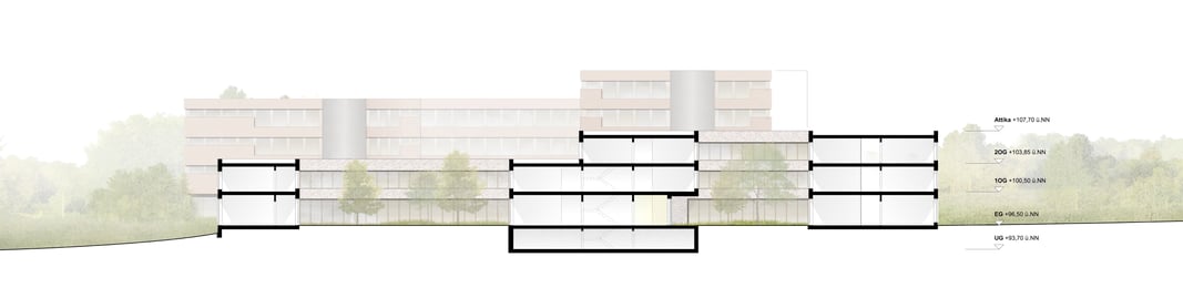 Die neu geplante Klinikerweiterung positioniert sich östlich vor dem bestehenden Baukörper und bildet einen freundlichen Auftakt, der sich in seinem architektonischen Ausdruck an dem historischen Klinikensemble orientiert. Über die Zuwegung in Verlängerung der Magistrale wird die zentralisierte KPP direkt vom Wienerbüttler Weg erschlossen. Der Neubau gliedert sich in zwei miteinander verbundenen Kuben mit zentralen Innenhöfen und erhält durch die Verwendung von rot-bräunlichen Ziegeln in Kombination mit großzügigen Fassadenöffnungen ein offenes und wohnliches Erscheinungsbild. Die Fassadenfläche wird durch Vor- und Rücksprünge und unterschiedliche Ziegelsortierungen strukturiert. Es entsteht ein lebendiges Licht- und Schattenspiel. Die weiße Farbe des Bestandsgebäudes kann im Zuge einer energetischen Sanierung durch wärmere Rotbrauntöne ersetzt.