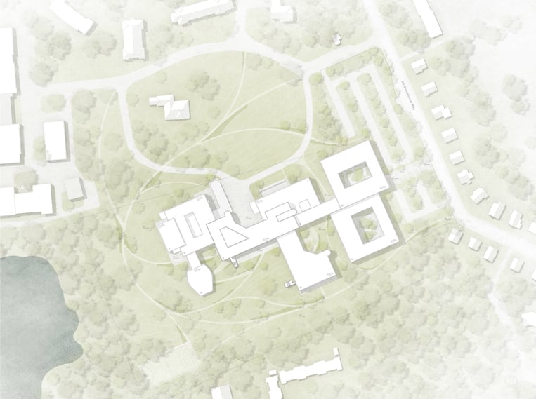 Die „harmonisch“ geschwungenen Wege verbinden den denkmalgeschützten Teil des Klinikgeländes und ermöglicht eine großzügige Ausnutzung der gegebenen Flächenpotenziale. Die Wege folgen der Topografie und überwinden im bequemen Gefälle die Hanglagen. Ausgedehnte Spaziergänge, abwechslungsreiche Blickachsen oder eine Pause im Schatten des bestehenden Baumbestandes schaffen hohe Aufenthaltsqualitäten. Die Innenhöfe der jeweiligen Therapiebereiche werden mit Rundwegen gestaltet. Der weitläufige, vielseitig gestaltete Garten ermöglicht aktive sportliche Bewegung an der Luft als auch Ruhepausen zur Entspannung.