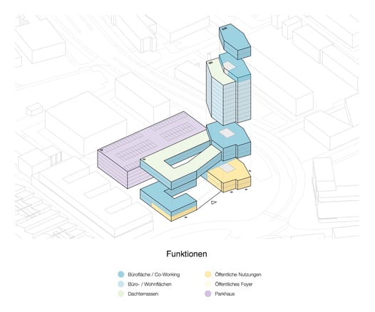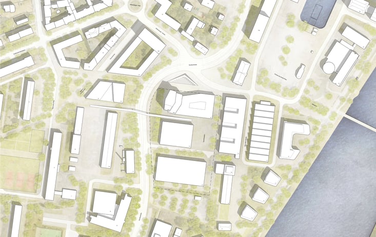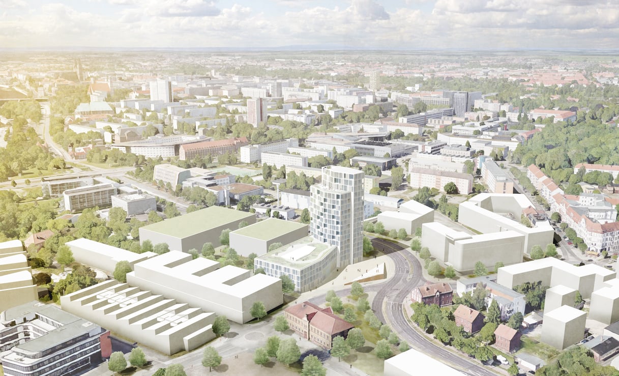 Durch den besonderen Standort zwischen Wissenschaftshafen, den Forschungsinstituten am Askanischen Platz und der Otto-von-Guericke-Universität bildet der Sandtorplatz mit seiner zukünftigen Bebauung den neuen „Quartierseingang“ zum Wissenschaftshafen. Die städtebauliche Ausformulierung des Hochhausentwurfes nimmt die Ideen aus dem Masterplan zur Bebauungsstruktur und der Ausbildung von starken Raumkanten am Sandtorplatz mit Publikums bezogenen Erdgeschossen auf. Durch das Einziehen der Kubatur entsteht ein großzügiger Vorplatz, welcher die Adressbildung am Sandtorplatz untermauert und Passanten vor dem Haupteingang zum Verweilen einlädt.