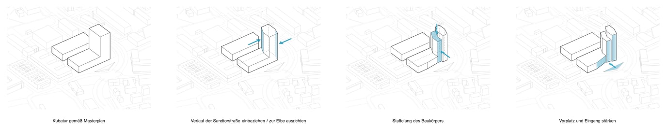 Um das neu entstehende Wissenschaftsquartier im städtischen Kontext sichtbar zu verankern sieht der Masterplan am Sandtorplatz bauliche Hochpunkte vor. Den Auftakt bildet das südlich gelegene und zur Elbe ausgerichtete Hochhaus im Speicherareal. Durch die exponierte Lage entsteht ein angemessener und selbstbewusster „Landmark“ entlang der Sichtachse Sandtorstraße. Durch leichtes Abschrägen der Längsfassaden und die frontseitige Verjüngung der oberen drei Geschosse bekommt der Gebäudekörper ein dynamisch, elegantes Erscheinungsbild. Durch die zeitlose und moderne Gestaltung, den integrativen Städtebau und die funktionale Einbindung in das Gebiet leistet der Hochhausentwurf einen bedeutenden Beitrag zum Innovationscharakter des Wissenschaftsquartiers.