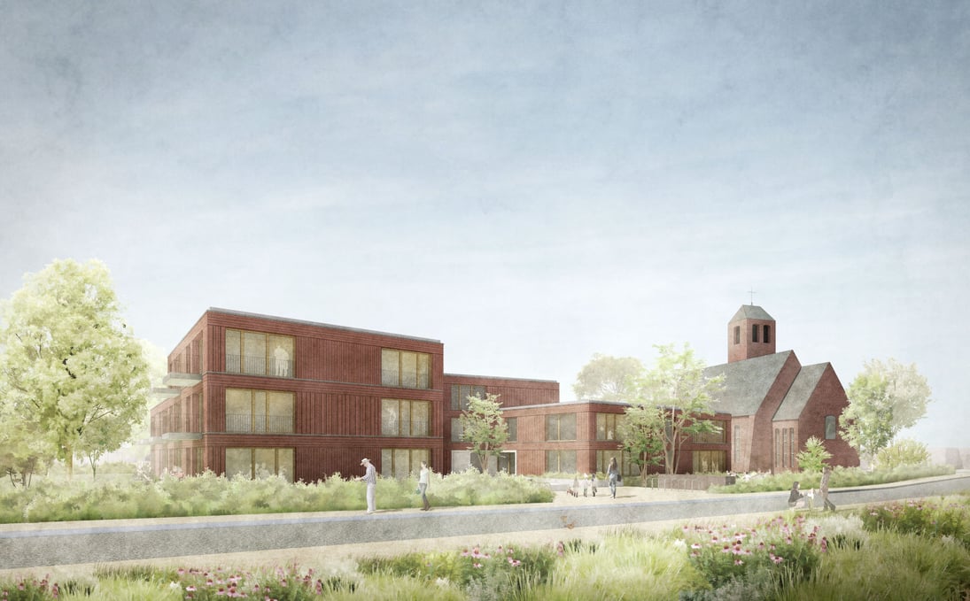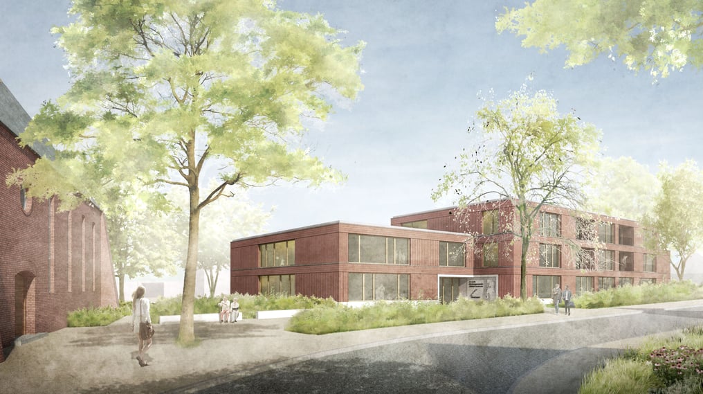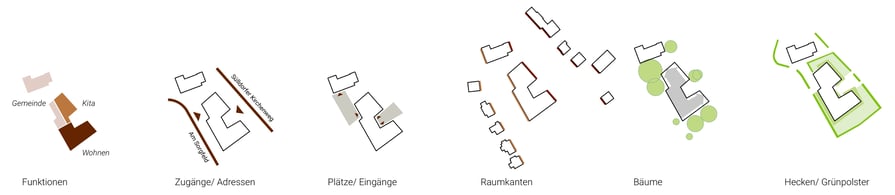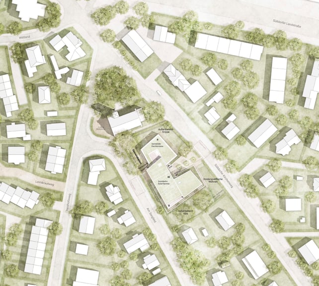Zur zukünftigen baulichen Entwicklung südlich der St. Michaelskirche in Sülldorf wird vorgeschlagen, die drei Nutzungen Gemeindehaus, KiTa und Wohnen in einem Baukörper zusammenzufassen. Einerseits passt sich dadurch das Gebäude gut in das städtebauliche Umfeld und den vorhandenen Baum- und Heckenbestand ein, andererseits werden zwei Vorplätze als Eingangsbereiche für die jeweiligen Nutzungen ausgebildet.