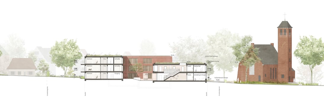 Angesichts des Klimawandels und der enormen Belastung der Umwelt durch die Herstellung massiver Baustoffe ist der vorliegende Entwurf so konzipiert, dass er sowohl als klassische Massivbau- als auch als Holzkonstruktion wirtschaftlich hergestellt werden kann. Als Fassadenmaterial ist lasiertes Holz vorgesehen. Die Farbigkeit der Lasur orientiert sich an der Farbe des Verblendsteins der Kirche, um das Haus in die Umgebung einzubinden.