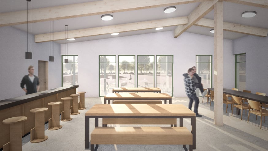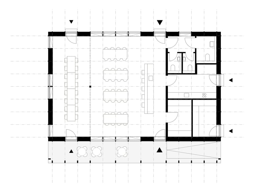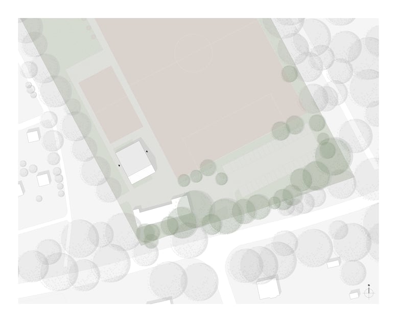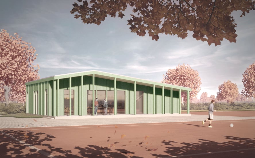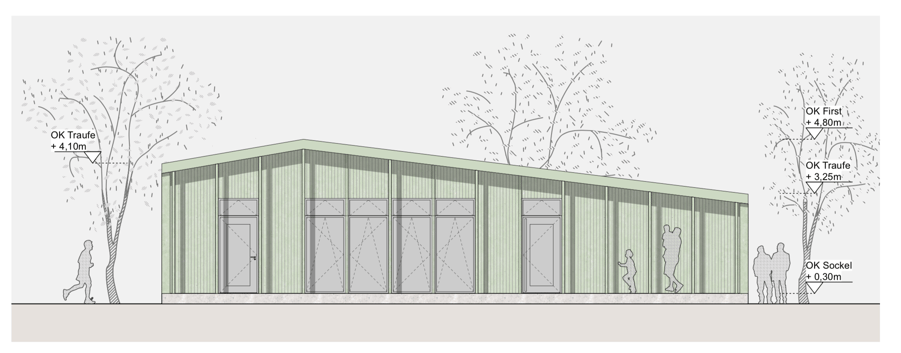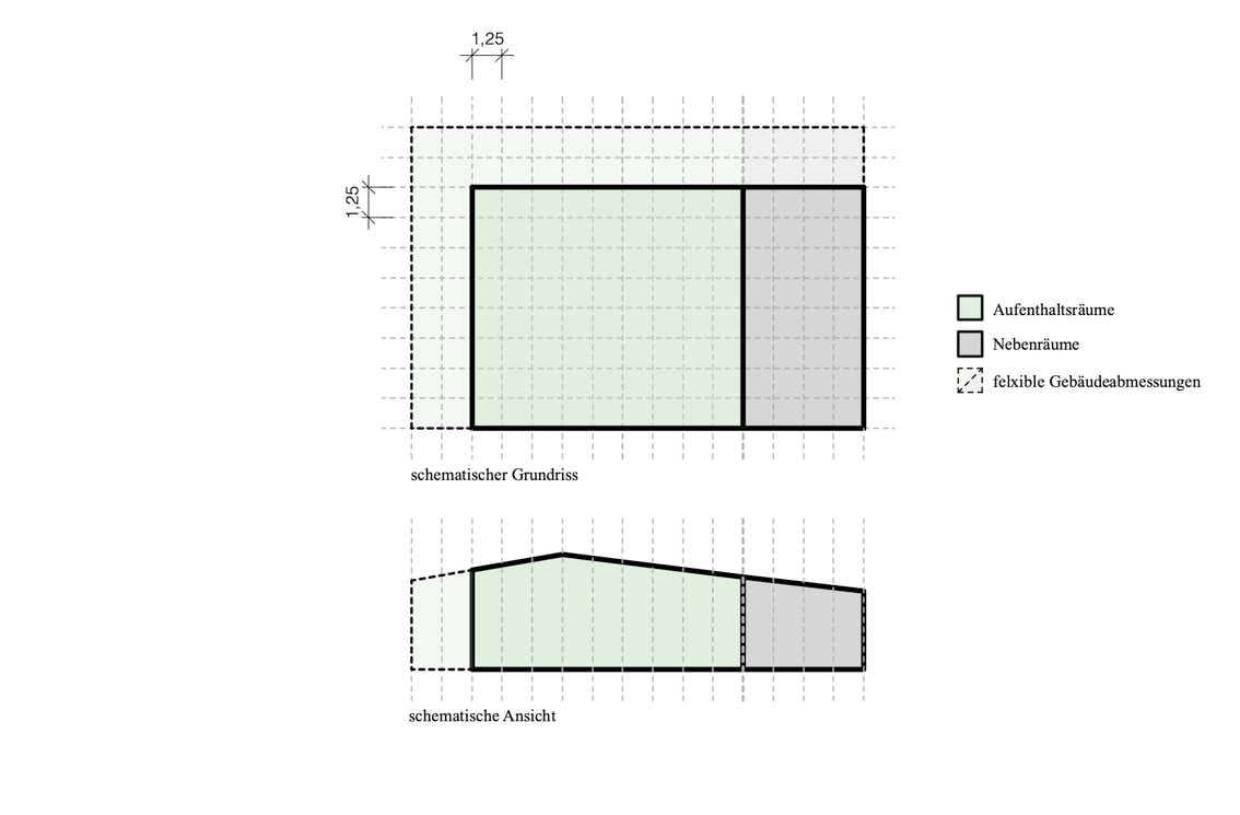 Herr & Schnell Architekten wurde gemeinsam mit Gonzales Hinz Zabala architects von der Stadt Hamburg beauftragt ein Typenhaus für Sportvereine zu entwickeln. Das Gebäude soll entsprechend der Bedarfe an den jeweiligen Standorten in unterschiedlichen Größen realisiert werden können. Die Gebäudekonstruktion, Fassaden und das Grundrisslayout basieren daher auf einem 1,25m Raster und die genauen Gebäudeabmessungen lassen sich standortspezifisch festlegen. Die Gebäude bestehen immer aus einem dreiseitig belichteten, großzügigen Aufenthaltsraum, welcher sich flexibel nach dem Bedarf des Nutzers unterteilen lässt und einem gebündelten Bereich mit den erforderlichen Nebenräumen. Das erste Typenhaus wird auf dem Sportgelände des SV Tonndorf-Lohe, westlich der Sportplätze entstehen. Das Vereinshaus beinhaltet u.a. einen Schank- und Jugendraum für Veranstaltungen, ein kleines Büro und eine Küche. Durch den Dachüberstand an einer Längsseite des Gebäudes entsteht eine großzügige, überdachte Aufenthaltsfläche im Freien. Die Vereinshäuser werden als Holzbauten in Holztafelbauweise hergestellt. Durch eine gleichmäßig, gerasterte Fassadengestaltung mit vertikalen Elementen entsteht ein ruhiges und angemessen kleinteilig gegliedertes Erscheinungsbild. Die zum Spotplatz ausgerichteten Giebelfassaden werden durch die Ausbildung eines flachgeneigten Satteldaches angemessen leicht betont und mit einer extensiven Begrünung versehen. Der konstruktive Holzschutz wird über die Ausbildung eines 30cm hohen Sockels gewährleistet und die barrierefreie Erschließung erfolgt über eine kleine Rampe im Bereich der überdachten Terrasse.